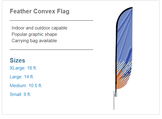 The Convex Flag is suitable for indoor and outdoor events. Effectively advertise your logo or message with our large feather angled flag. Available hardware options including a heavy duty cross base or ground stake to fit to your pole set.